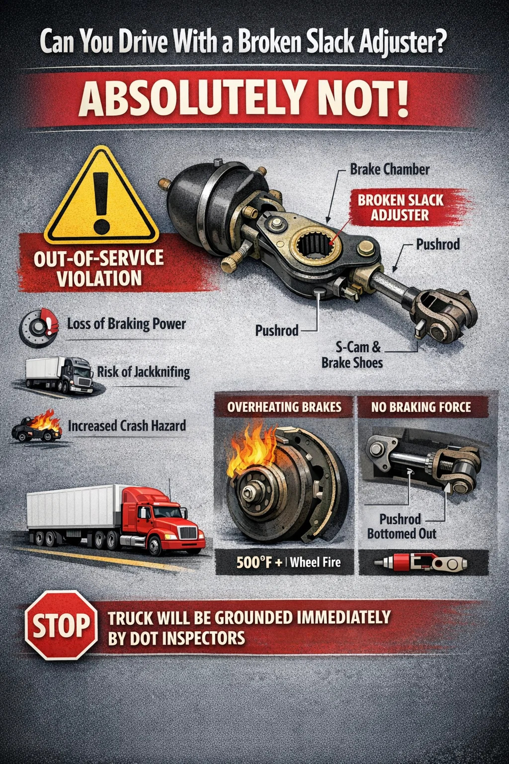 Det korte svaret er absolutt ikke. Du kan ikke lovlig eller trygt kjøre et nyttekjøretøy med en ødelagt, feilfungerende eller feiljustert slakkjustering. I øynene til Department of Transportation (DOT) og sikkerhetsinspektører, en ødelagt slakkjustering er et "ute-av-tjeneste"-brudd. Hvis du blir tatt i bruk av et kjøretøy med denne defekten, vil lastebilen din bli jordet umiddelbart på inspeksjonsstedet.
