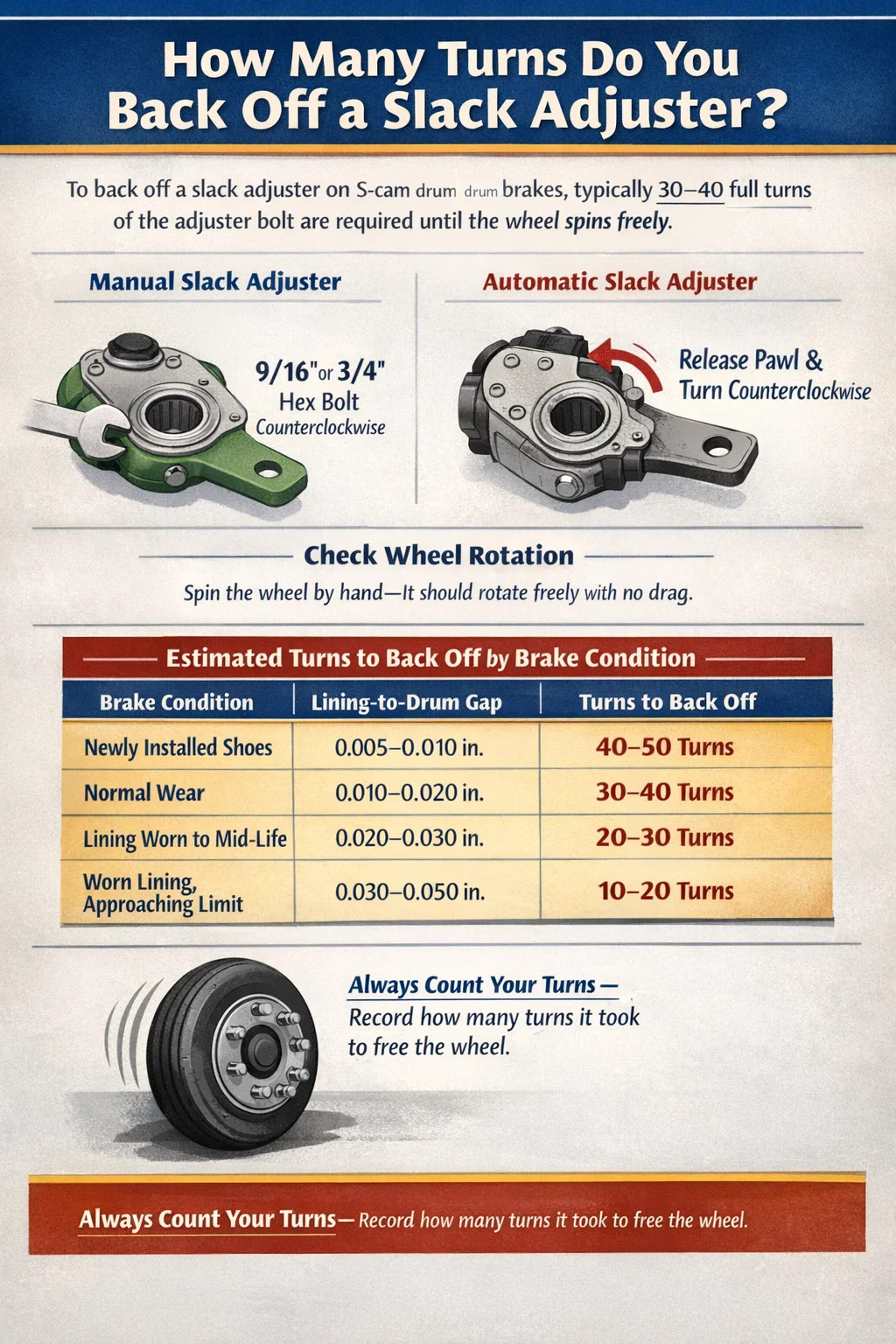 Standard prosedyre for å rygge av en slakkjustering er ca. 30 til 40 hele omdreininger av den manuelle justeringsbolten — eller til bremseskoene trekker seg helt tilbake fra trommelen og hjulet roterer fritt uten drag. For automatiske slakkjusteringer (ASA-er) er utløsningsprosessen litt forskjellig: du kobler ut sperremekanismen og trekker justeringen manuelt av til skyvestangens bevegelse er innenfor spesifikasjonene eller bremsene er fri av trommelen. Det nøyaktige antallet svinger varierer avhengig av merke, modell og gjeldende bremsejusteringstilstand, men 30–40 omdreininger er en pålitelig grunnlinje for de fleste S-cam trommelbremsesystemer.