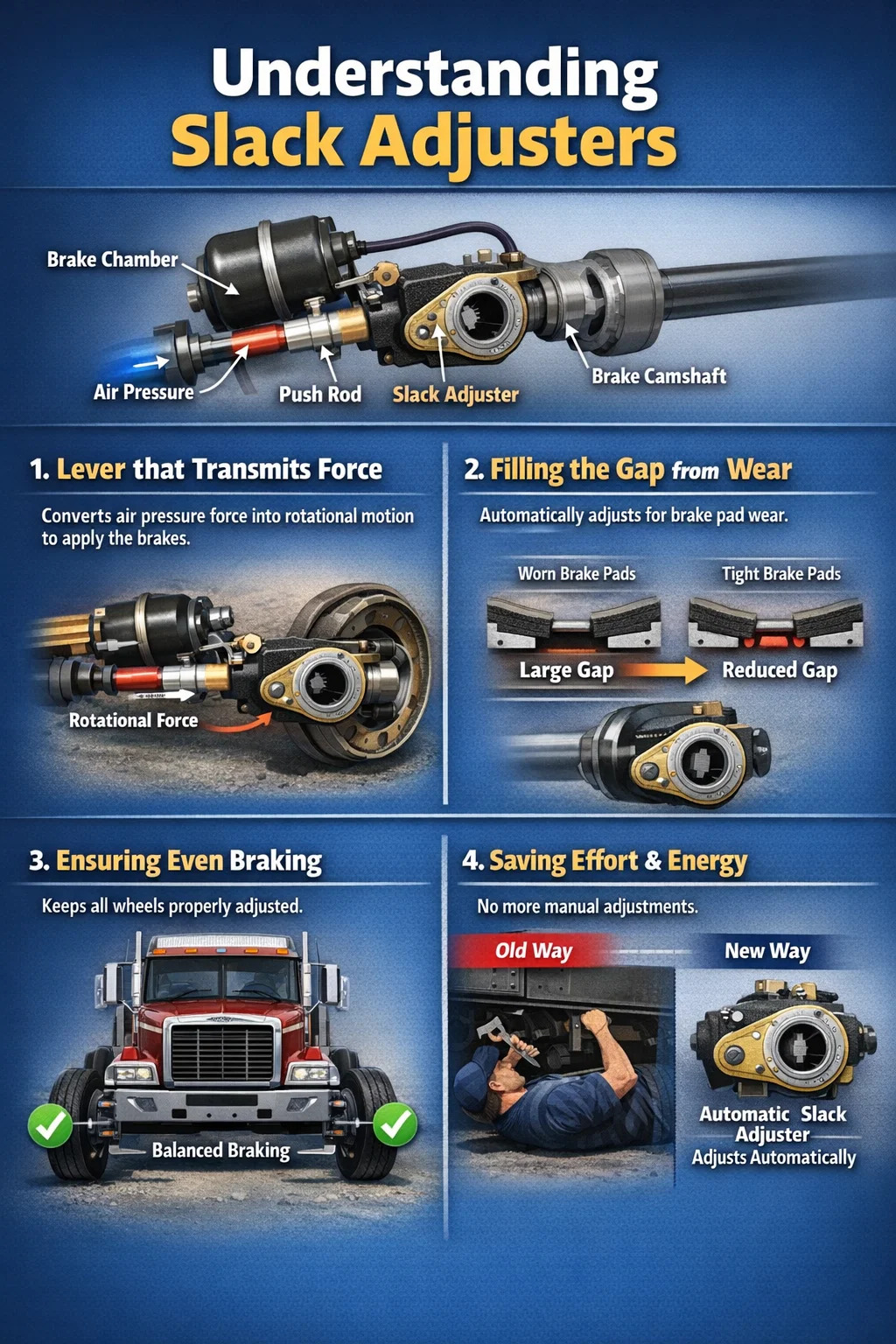 Slakkjusteringer er som en "oversetter" og "automatisk leder" i bremsesystemet til store lastebiler og busser. De er plassert mellom bremsekammeret og bremseakselen.