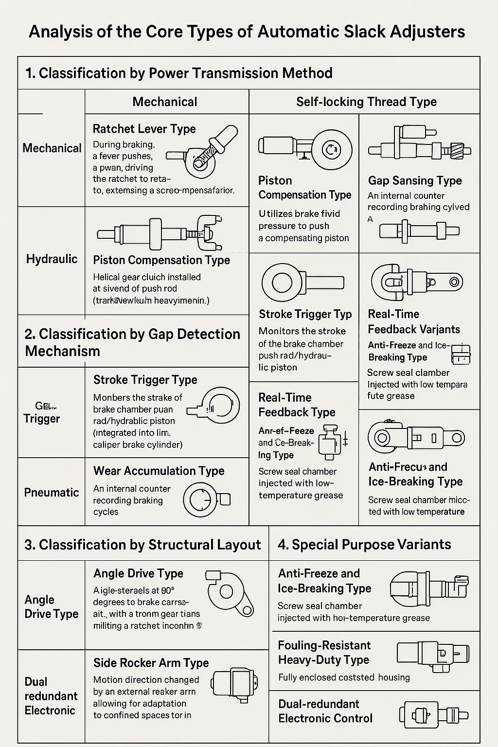Ratchet -spak Type: Under bremsing skyver en spak et labb, og kjører skralleren for å rotere ensrettet, og utvide en skrue for å kompensere for klaring (en mainstream -design for lastebiler).