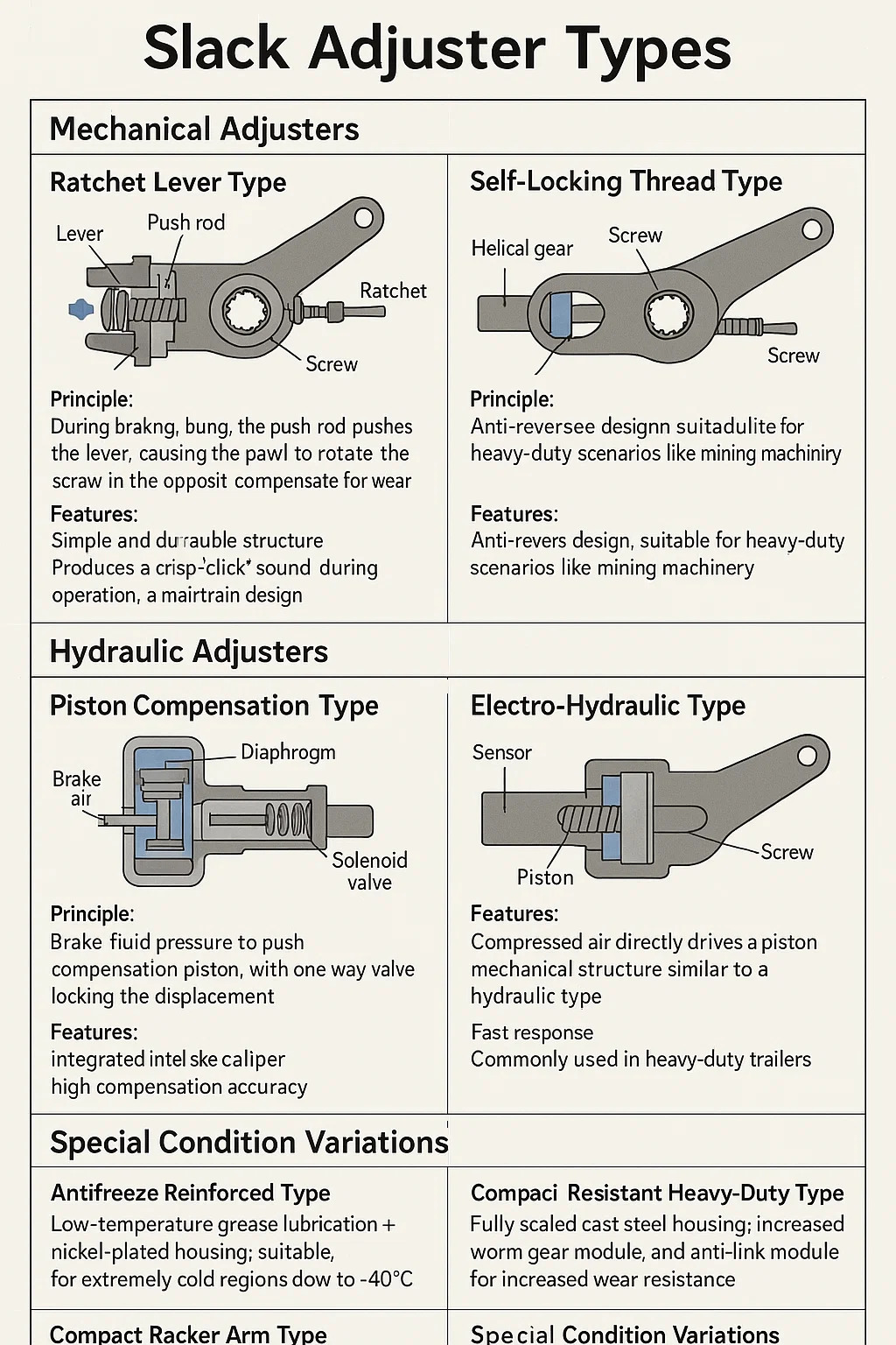 Prinsipp: Under bremsing skyver skyvestangen spaken, noe som får sperren til å rotere sperren, noe som resulterer i en liten forlengelse av skruen for å kompensere for slitasjeslakk.