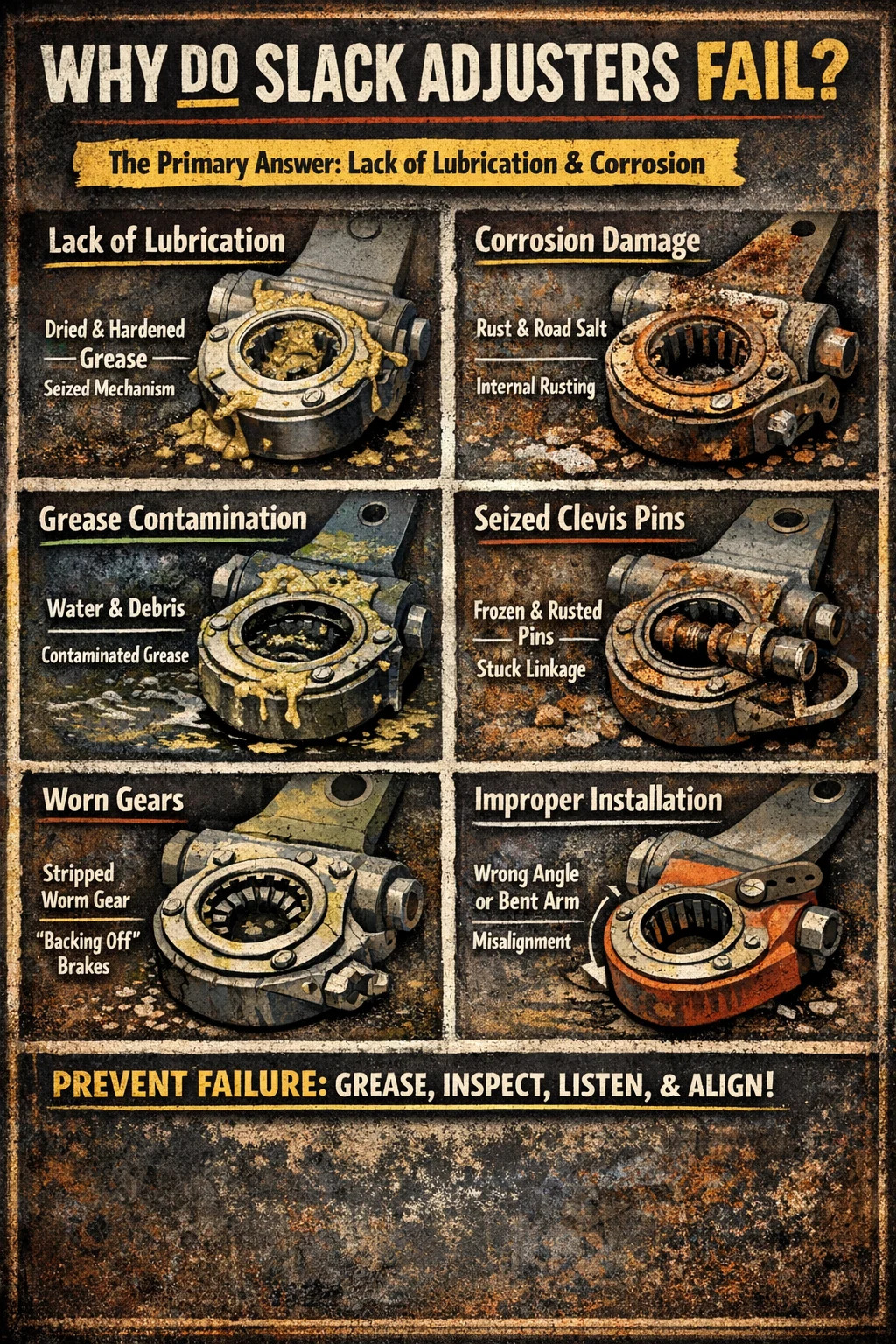 I de aller fleste tilfeller, slakkjusteringer mislykkes på grunn av mangel på rutinemessig smøring og miljøkorrosjon. Fordi disse komponentene er plassert på undersiden av chassiset, blir de konstant bombardert av veiavfall, vann og etsende avisingskjemikalier. Når det innvendige fettet tørker ut eller blir forurenset, griper den delikate innvendige skrallemekanismen seg fast eller slites ned, og forhindrer at komponenten automatisk justerer bremseskoklaringen. Sekundære årsaker inkluderer intern mekanisk slitasje på girene og feil installasjon av kontrollarmen.